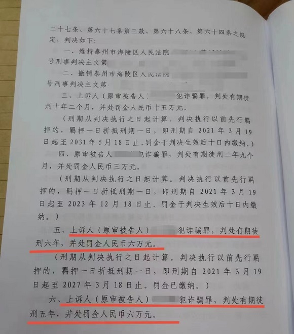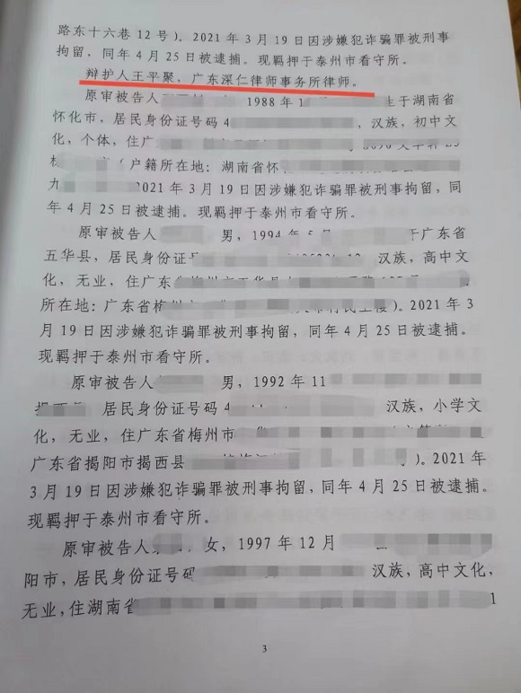 某二十歲小伙誤入電詐團伙被認定為主犯一審判十年,王平聚律師二審在江蘇泰州中院爭取開庭改判四年。王平聚律師團隊律師也為另外兩位判十年的被告人爭取到改判五年、六年。